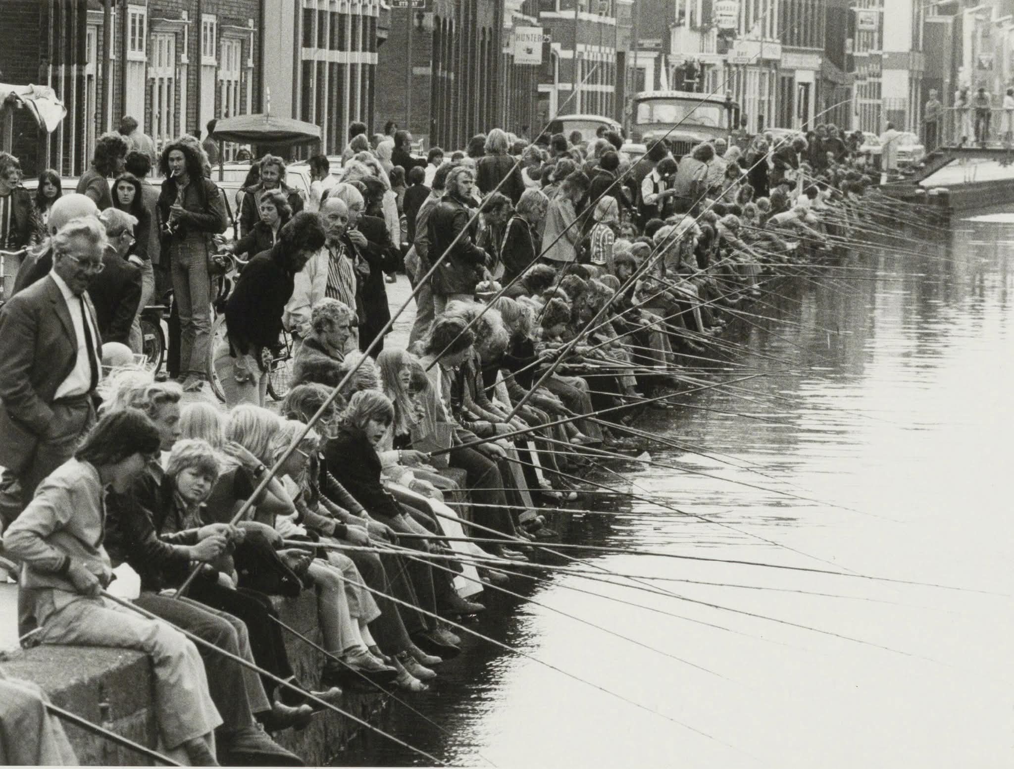Foto: Viswedstrijd voor de jeugd aan de Brouwersvaart in de binnenstad van Haarlem in 1974.